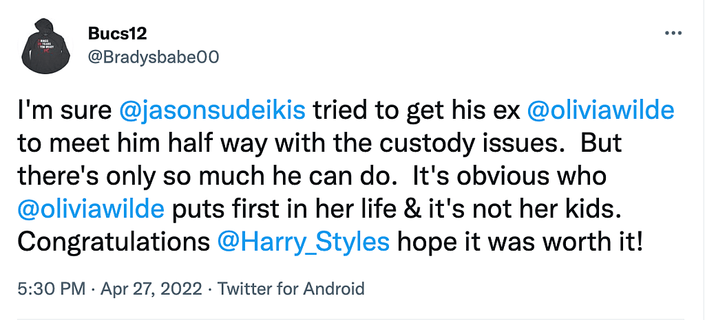 Another an added, “I’m sure Jason Sudeikis tried to get his ex, Olivia Wilde, to meet him half way with the custody issues. But there’s only so much he can do. It’s obvious who Olivia Wilde puts first in her life & it’s not her kids. Congratulations Harry Styles hope it was worth it.”