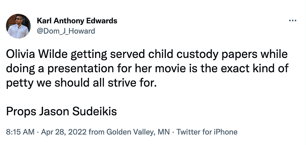 “Olivia Wilde getting served child custody papers while doing a presentation for her movie is the exact kind of petty we should all strive for. Props Jason Sudeikis,” one person tweeted.