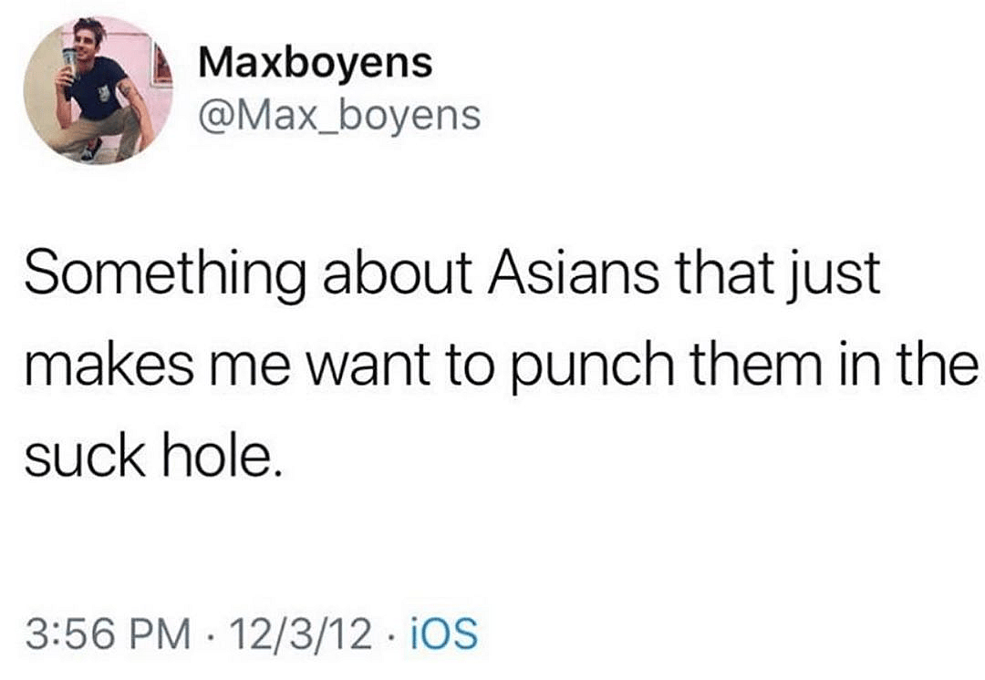Another tweet dated December 3, 2012 read, “Something about Asians that just makes me want to punch them in the suck hole.”