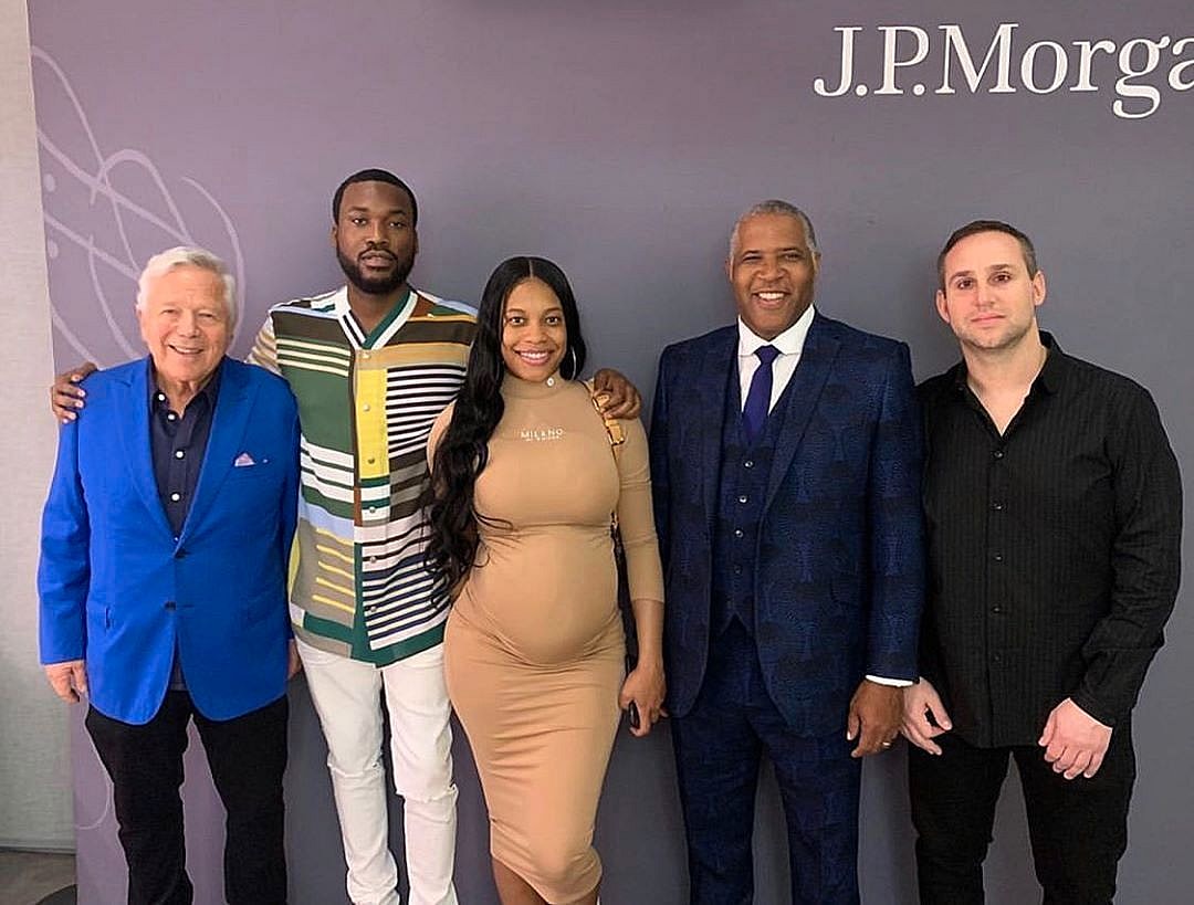 After his ex-girlfriend Nicki Minaj claimed he was broke in their nasty back and forth Twitter feud, Meek Mill responded by posting a photo with a very pregnant Milan Harris, billionaire businessman Robert Kraft, and several other financial tycoons at a J.P. Morgan “billionaire summit” on Friday. Announcing that the event was “a learning experience,” Meek Mill cuddled up to his baby mama for the snap while also showing off his friendship with Robert Kraft by throwing an arm over the controversial New England Patriots owner. Back in December, fans were stunned when the fashion designer showed off her growing baby bump during one of her shows. While she did not reveal who the baby daddy was, many speculated she was pregnant with Meek Mill’s child since the two had been longtime linked but never confirmed their relationship until recently.