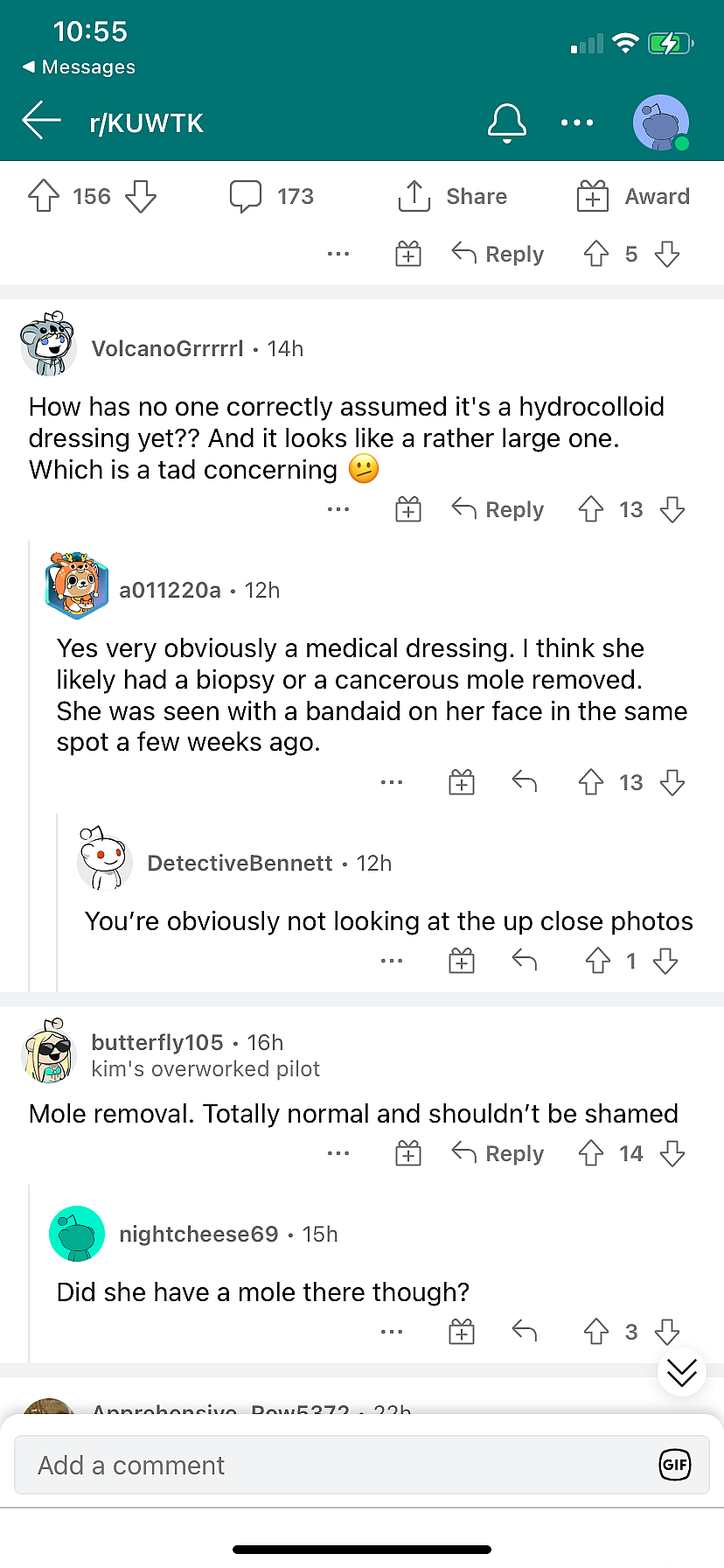 A Reddit user replied to the sub-Reddit writing, “Yes, very obviously a medical dressing. I think she likely had a biopsy or a cancerous mole removed. She was seen with a band-aid on her face in the same spot a few weeks ago.”