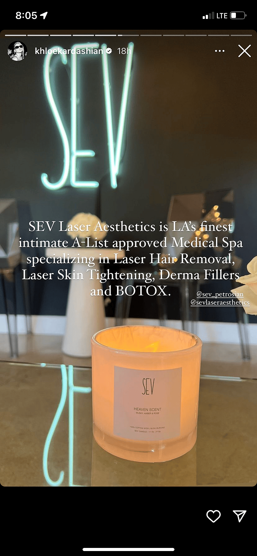 “SEV Laser Aesthetics is LA’s finest intimate A-List approved Medica Spa specializing in Laser Hair Removal, Laser Skin Tightening, Derma Fillers and BOTOX,” she shared along with a photo of the neon “SEV” light and candle.