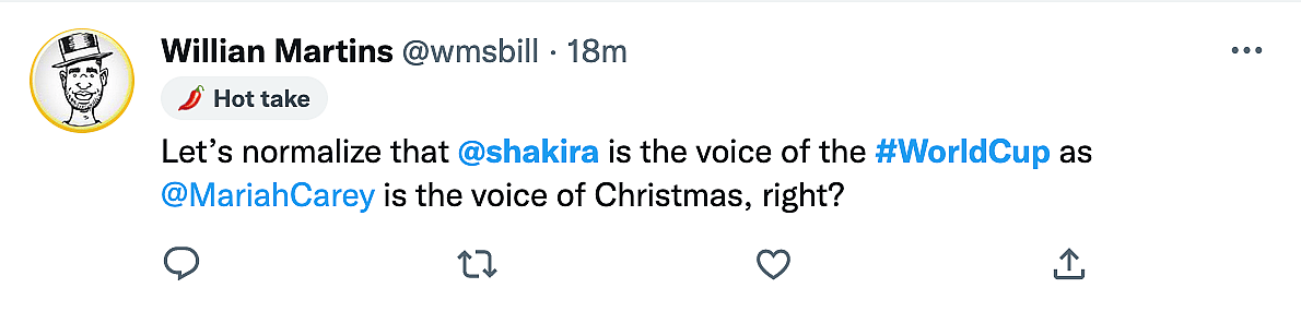 “Let’s normalize that Shakira is the voice of the #WorldCup as Mariah Carey is the voice of Christmas, right?”