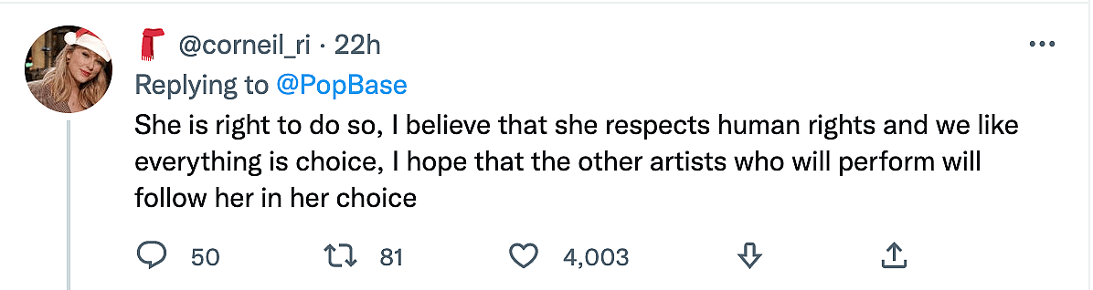 “We stand with her,” one person tweeted before adding, “She is right to do so, I believe that she resepcts human rights and we like everything is choice, I hope that the other artists who will perform will follow her in her choice.”