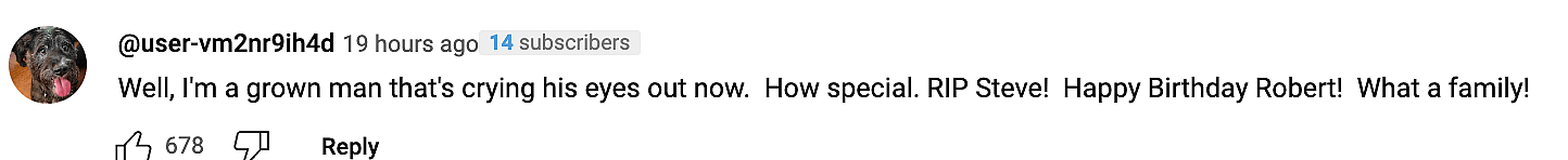 “Well I’m a grown man crying his eyes out now. How special. RIP Steve! Happy Birthday Robert! What a family!” one fan commented.