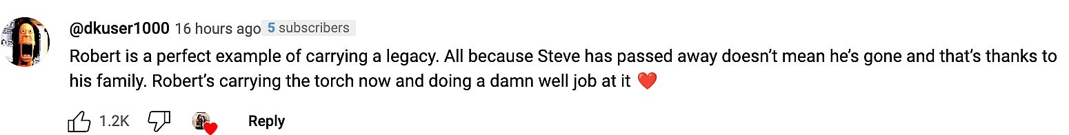 “Robert is a perfect example of carrying a legacy. All because Steve has passed away doesn’t mean he’s gone and that’s thanks to his family. Robert’s carrying the torch now and doing a damn well job at it,” a fan praised.