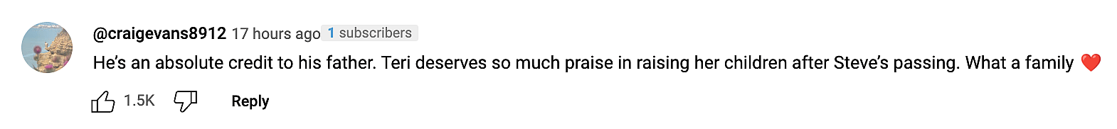 “He’s an absolute credit to his father. Terri deserves so much praise in raising her children after Steve’s passing. What a family ❤️,” another echoed.