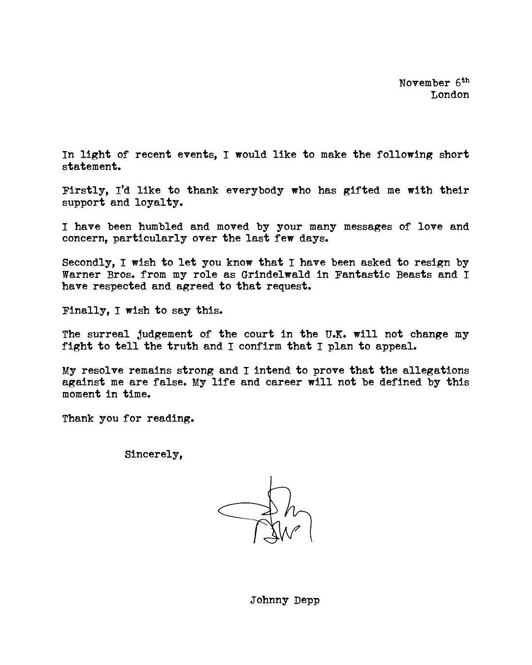 “In light of recent events, I would like to make the following short statement. Firstly, I’d like to thank everybody who has gifted me with their support and loyalty,” Depp wrote.