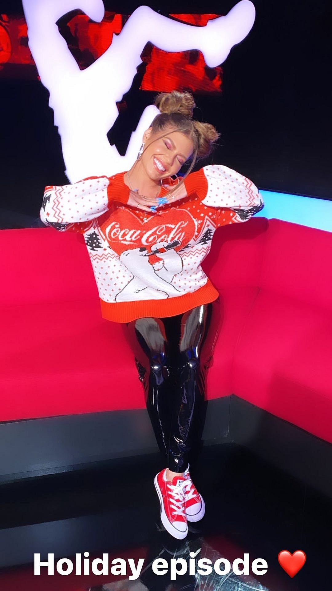 For her third and final ensemble, she returned to the shiny PVC look but opted for pants and a Christmas sweater instead of a dress. Her red and white Chuck Taylors went perfectly with her Coca-Cola sweater. The cute and comfy top featured the iconic polar bears from the Christmas commercials (90s kids will remember).