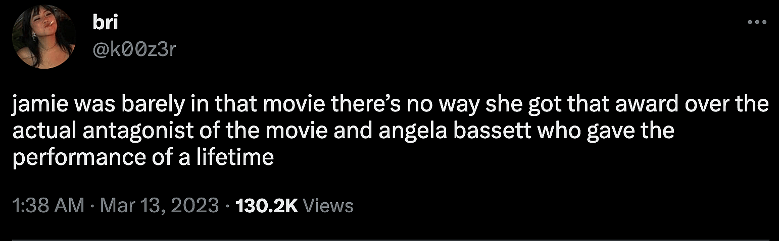 One commenter expounded their point, writing, “Jamie was barely in that movie there’s no way she got that award over the actual antagonist of the movie and Angela Bassett who gave the performance of a lifetime.”