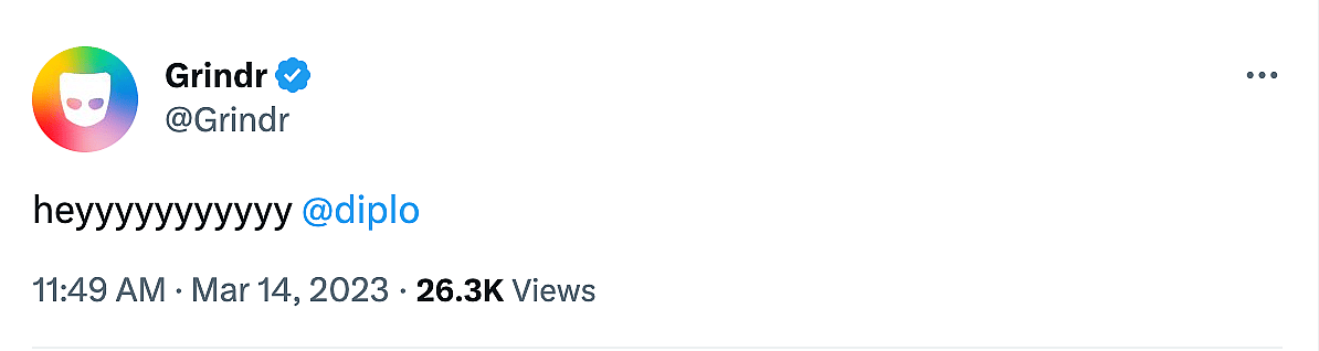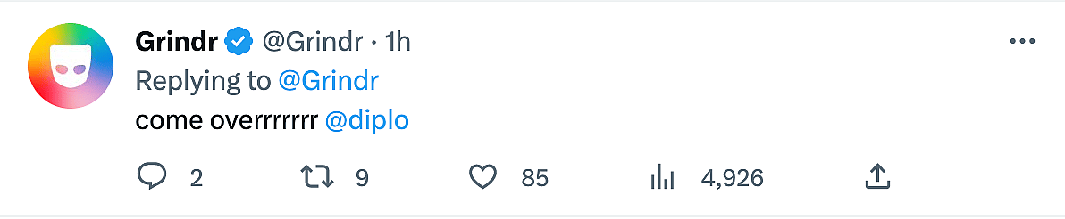 The official account for Grindr tweeted, “Heyyyyyyy come overrrrrr @diplo.”