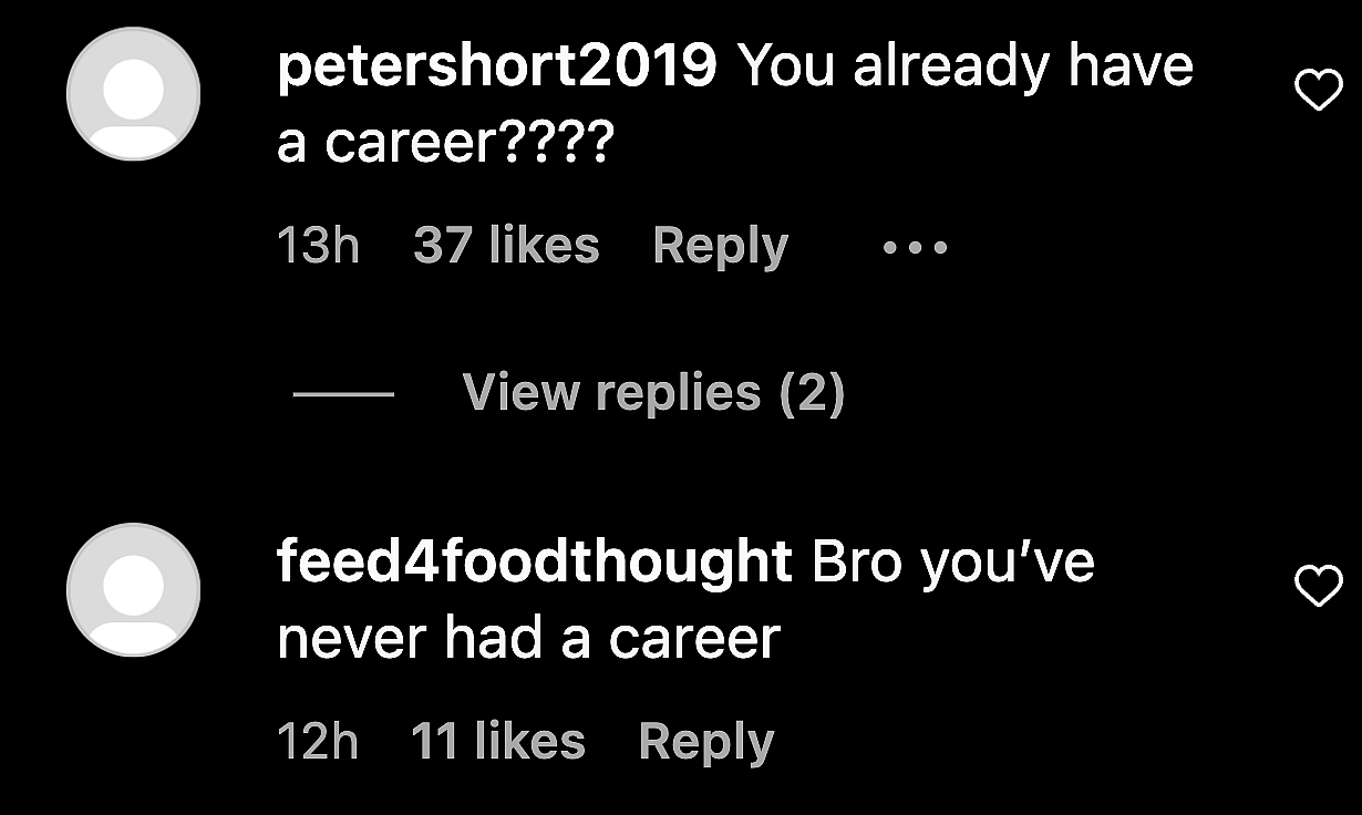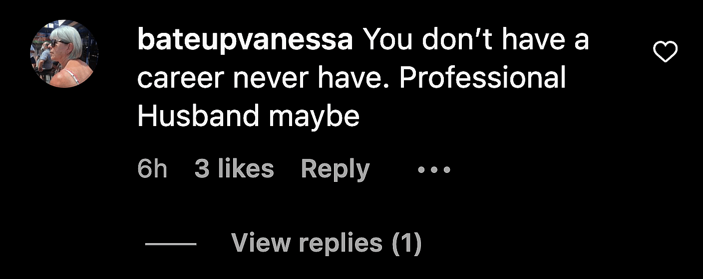 More comments about the youngster’s job rolled in. “You don’t have a career never have. Professional husband maybe,” a follower bluntly stated, while another critic added, “Change on career, you need to get one first, it’s called a job.”