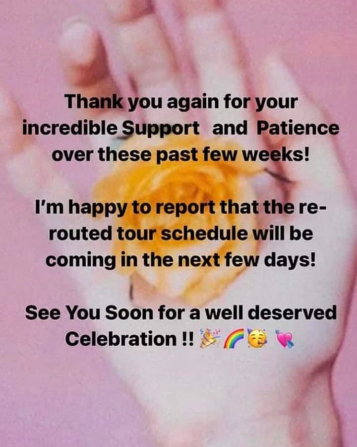 The singer expressed gratitude for fans’ patience and announced that new tour dates will be revealed soon.