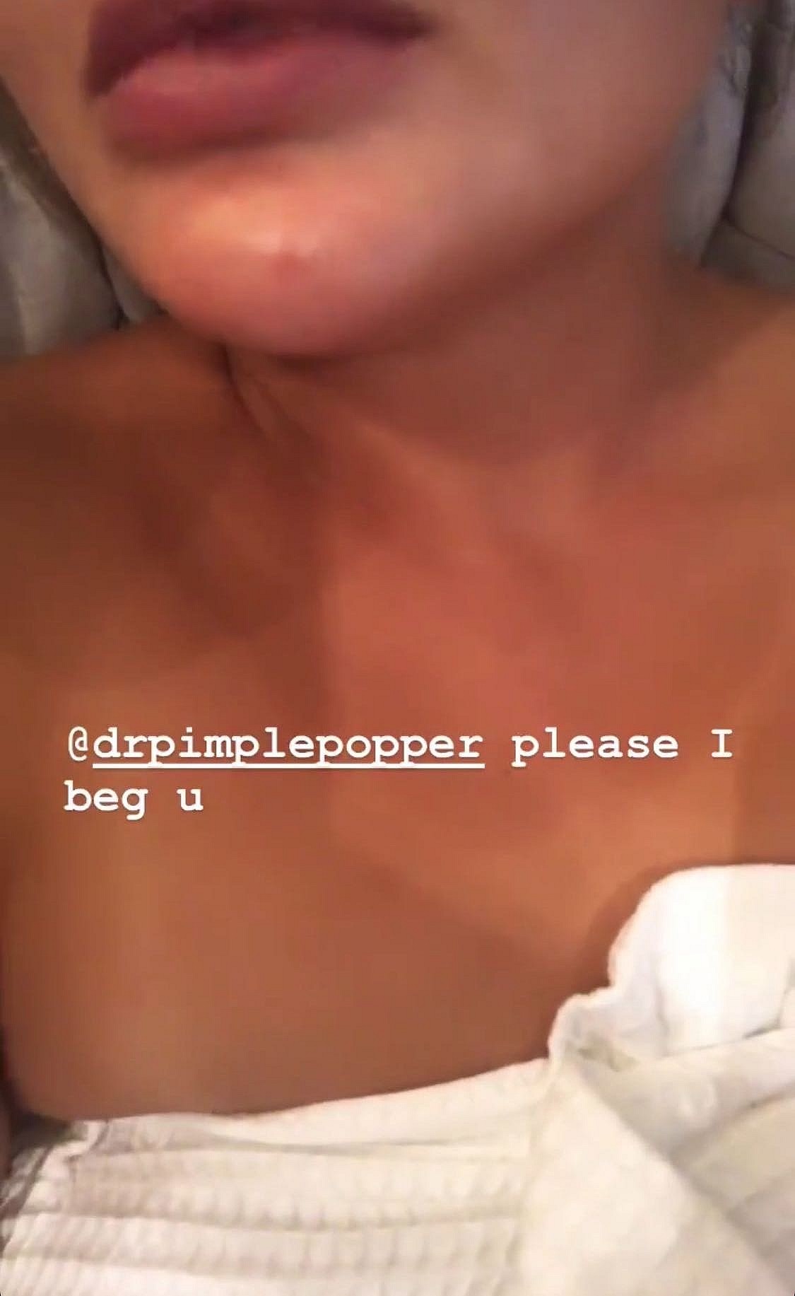 Showing off her noticeable blemish, Chrissy wrote, “please I beg you” while tagging the zit doctor.