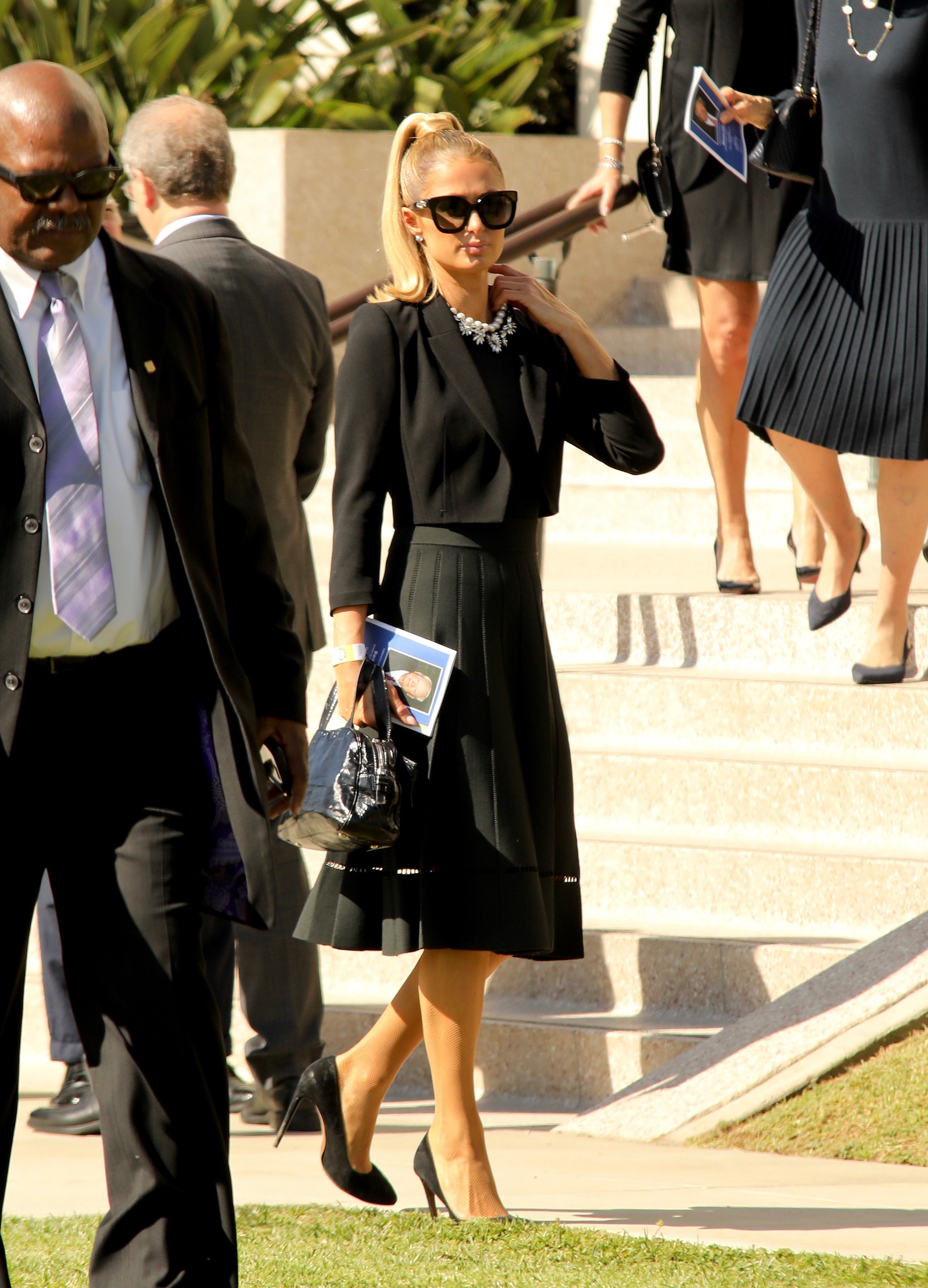 The jet-setting DJ was photographed leaving Barron Hilton‘s memorial at Good Shepard Church in Beverly Hills on Saturday.