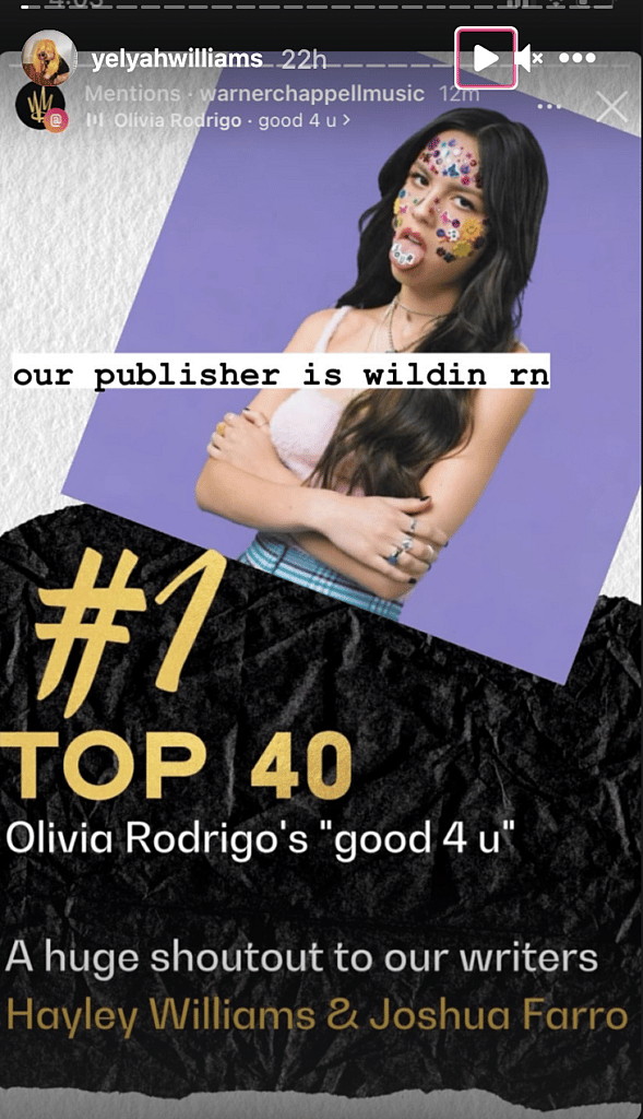 She reposted Warner Chappell Music’s IG Story showing Olivia’s “Sour” album cover with “Good 4 U” as #1 on the top 40.