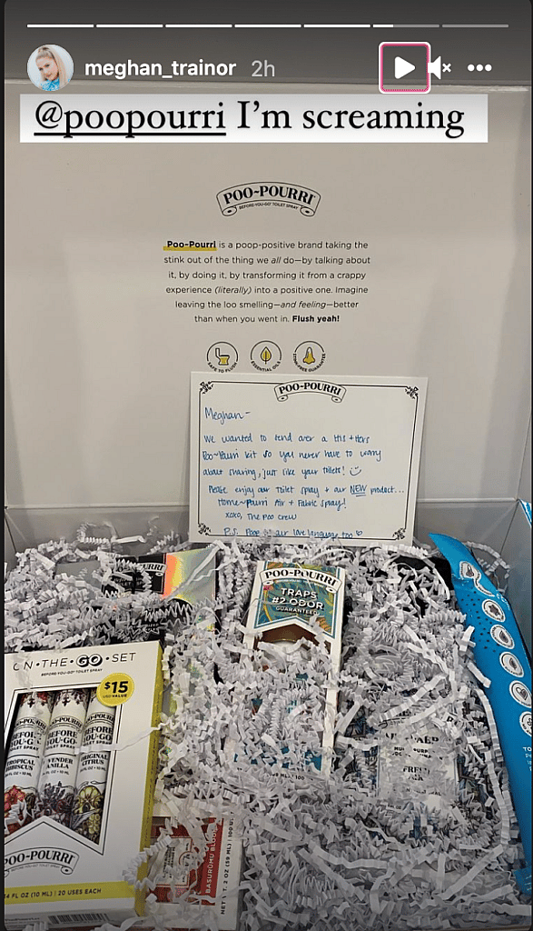 She posted a photo of the present with a note that read, “Meghan, we wanted to send over a His+Hers Poo-Pourri kit so you never have to worry about sharing; just like your toilet! Please enjoy our toilet spray and our NEW product… Home-Pourri Air+Fabric spray! XOXO, The Poo Crew. P.S. Poo is our love language too.”