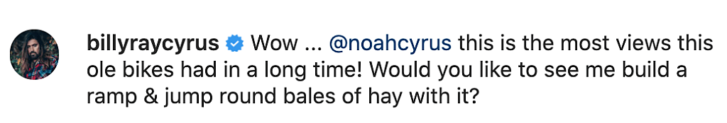 He captioned the reposted video to his Instagram grid, “Wow … @noahcyrus this is the most views this ole bikes had in a long time! Would you like to see me build a ramp & jump round bales of hay with it?”
