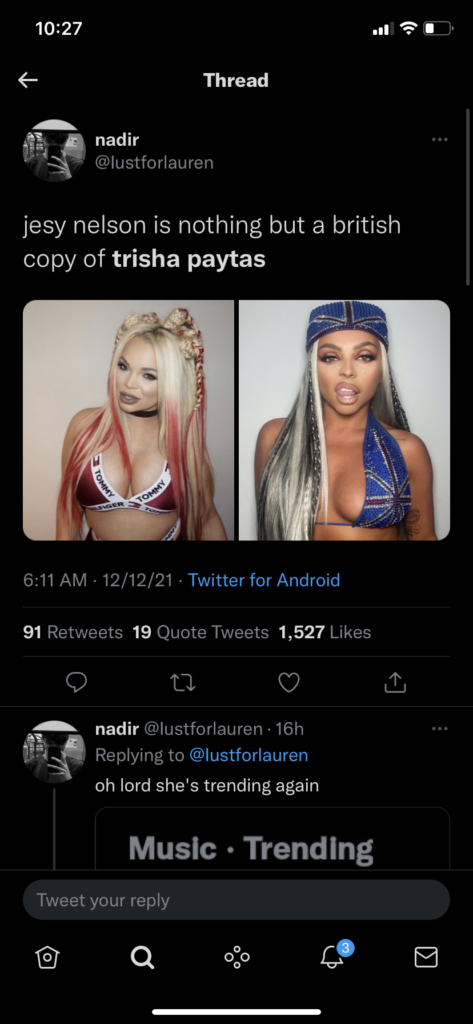 “Jesy Nelson is the Trisha Paytas of the UK,” and “Jesy Nelson is nothing but a British copy of Trisha Paytas,” other people tweeted.
