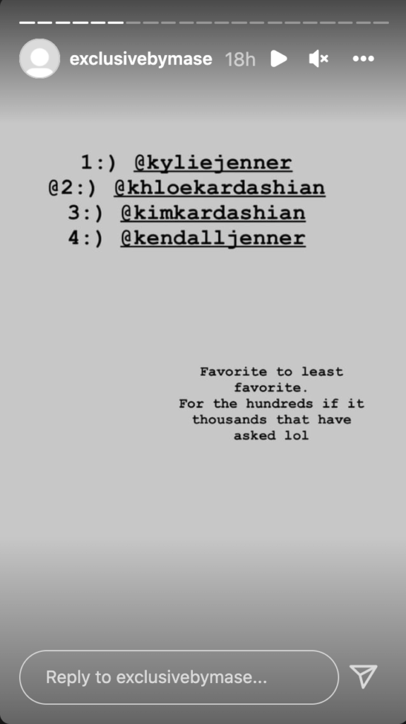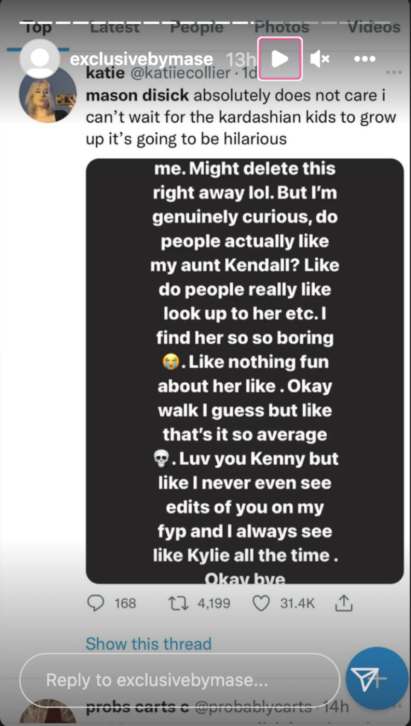 The post read, “Okay I’m being honest don’t come at me. Might delete this right away lol. But I’m genuinely curious, do people actually like my aunt Kendall? Like do people really like look up to her etc. I find her so so boring. Like nothing fun about her life. Okay walk I guess but like that’s it so average. Luv you Kenny but like I never even see edits of you on my fyp and I always see like Kylie all the time. Okay bye.”