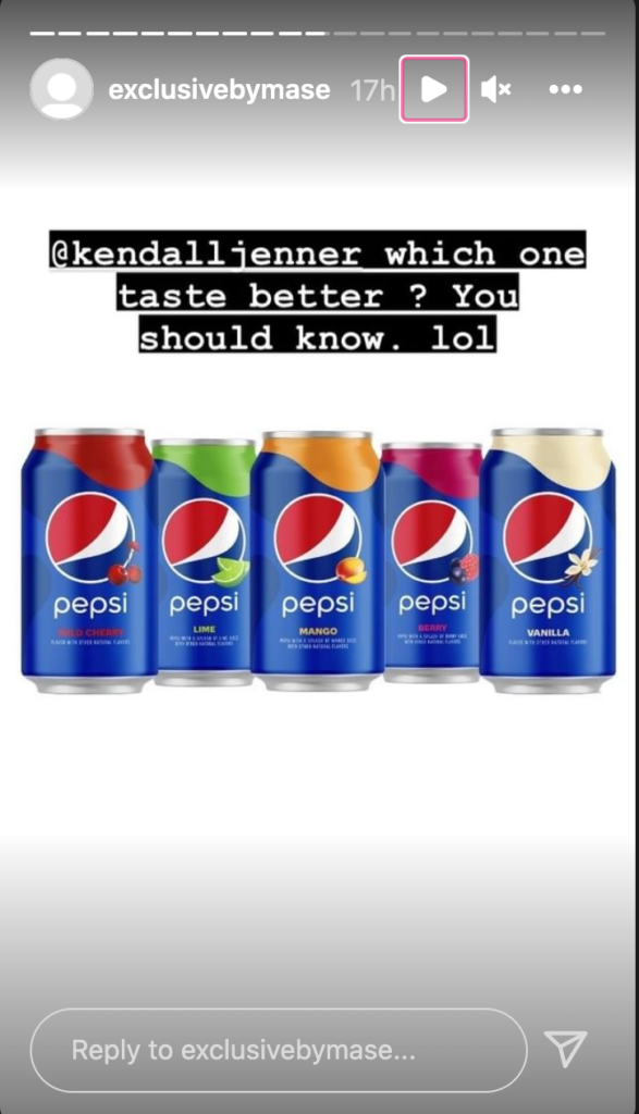 A photo of different flavored Pepsi cans and captioned the pic, “Kendall Jenner which one taste better? You should know. Lol.”