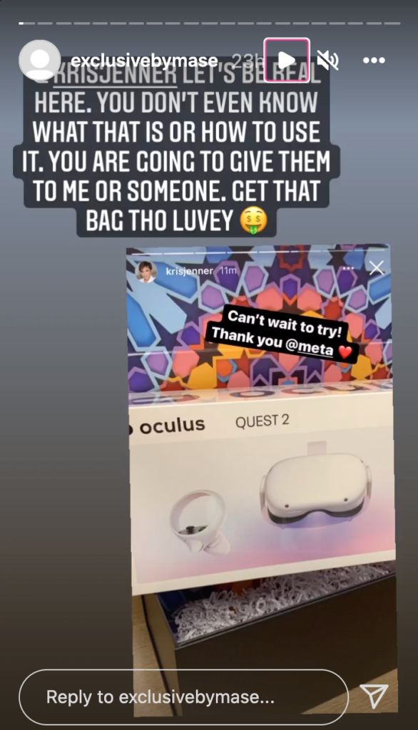 The momager posted a picture of an Oculus to her Instagram Story on Monday.