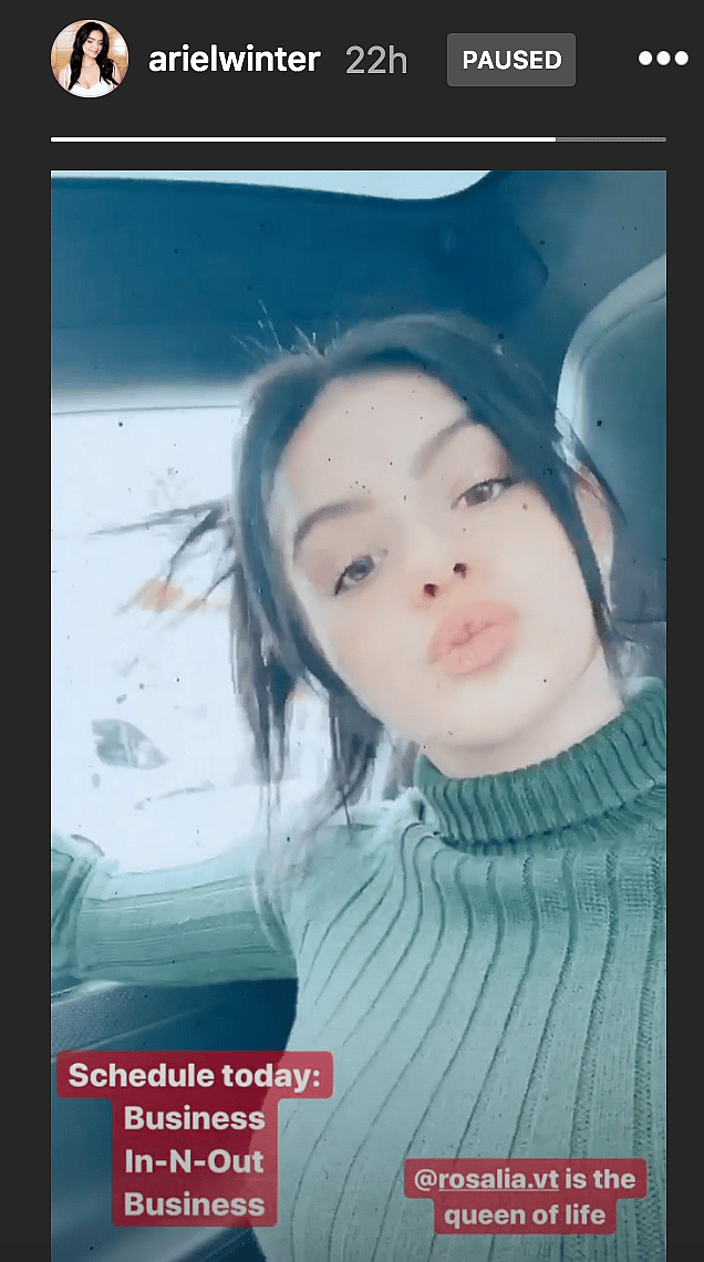 Dominos isn’t the only fast food Ariel Winter likes to chow down on. Earlier in the day, she showed herself approaching the In-N-Out Burger drive-thru in between business meetings. This time, she covered up while wearing a green turtleneck. Posing in her car, the “Modern Family” star blew a kiss to the camera and proudly displayed the fast-food chain in her proximity. “Schedule today: Business In-N-Out Business,” Ariel Winter captioned the video as she listed to Rosalía in the background.