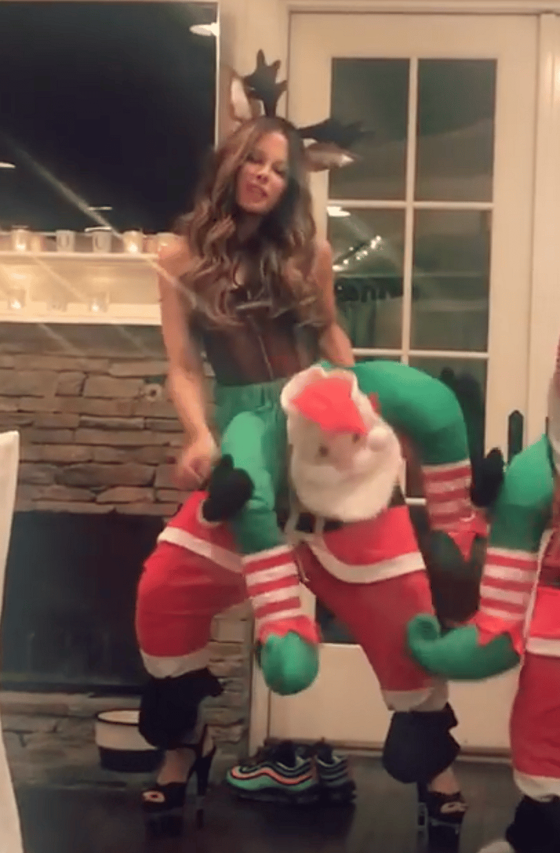 Dressed in a hilarious Christmas costume, Beckinsale and her friend both appeared to be reindeer riding atop Santa’s shoulders. At least for the star, Santa didn’t mind becoming the sleigh and bumped to the beat while Beckinsale gyrated, clearly full of the Christmas spirit.
