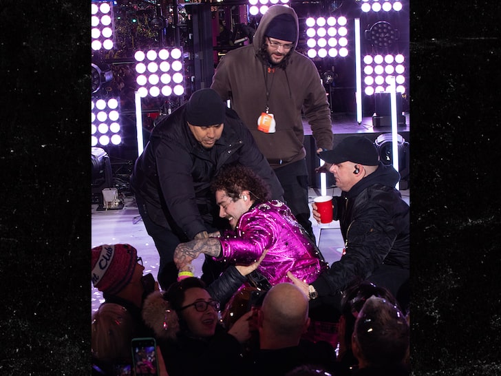 Post was one of the many performances who jumped on stage in Time’s Square as the countdown ticked off the last moments of the decade. What’s unclear … was Post already in the crowd when he lost his footing or did he flat-out fall off the stage? What is clear … security had to help him up.