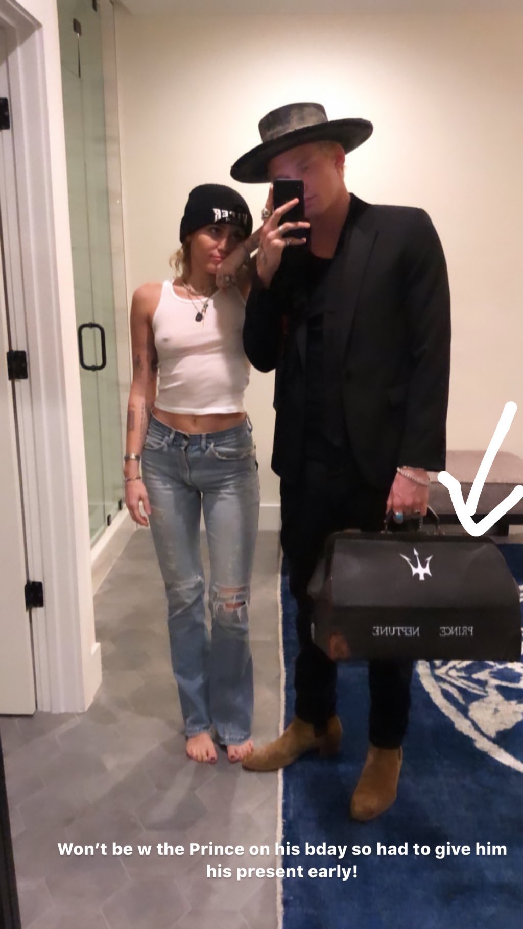 Cody Simpson seemed pretty happy with his birthday present AND his girlfriend after Miley Cyrus gave him his vintage personalized gift then posed alongside him without a bra. The Australian singer is turning 23 on Saturday, but Miley can’t be with her new beau so she presented her thoughtful present to him two days early. Posting her gift on her Instagram story Thursday, Miley Cyrus revealed she got Cody Simpson a personalized doctor’s bag reading, “Prince Neptune,” a nod to his book title.