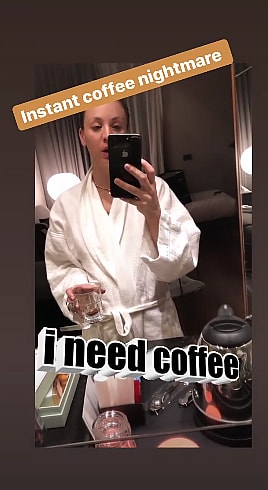 The “Big Bang Theory” actress made headlines yesterday for sharing her jet-lagged activities on social media – if you aren’t up-to-date, 34-year-old Kaley shared her “instant coffee nightmare” after discovering that the so-called “coffee machine” in her Italian hotel room was nothing more than an electric kettle and sachets of instant coffee.