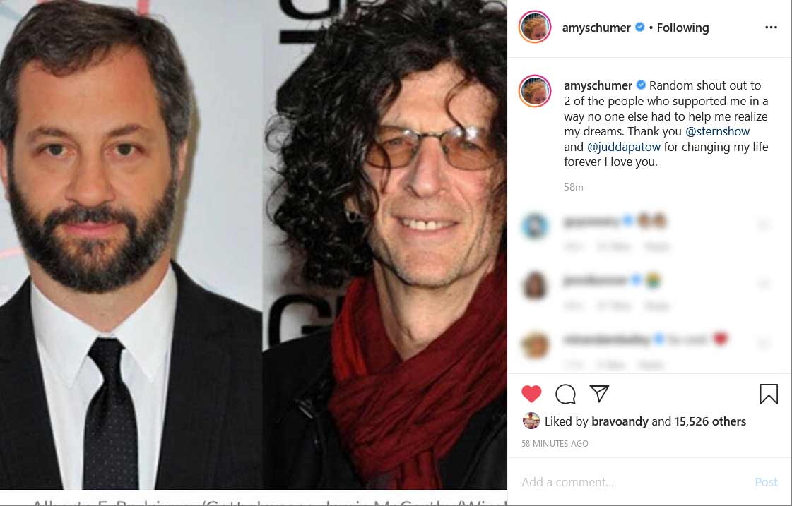 “Random shout out to 2 of the people who supported me in a way no one else had to help me realize my dreams. Thank you @sternshow and @juddapatow for changing my life forever I love you,” Amy wrote in the caption of her post.