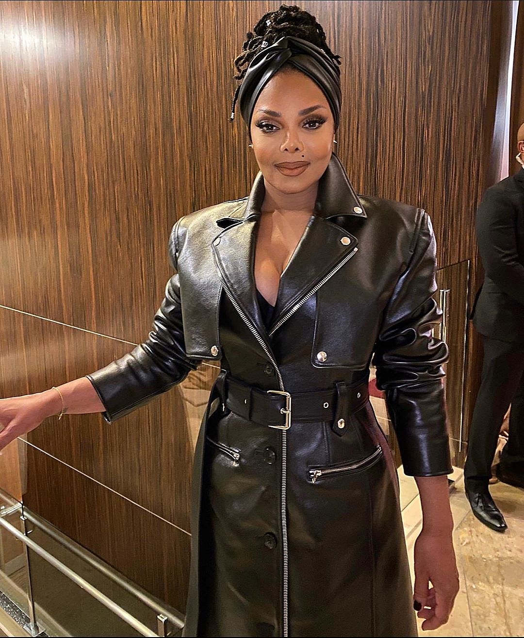 Janet stood out from the crowd in a sleek black leather trenchcoat designed by Alexander Wang that featured tons of cleavage. She wore a matching leather headwrap that held up her beautiful braids.