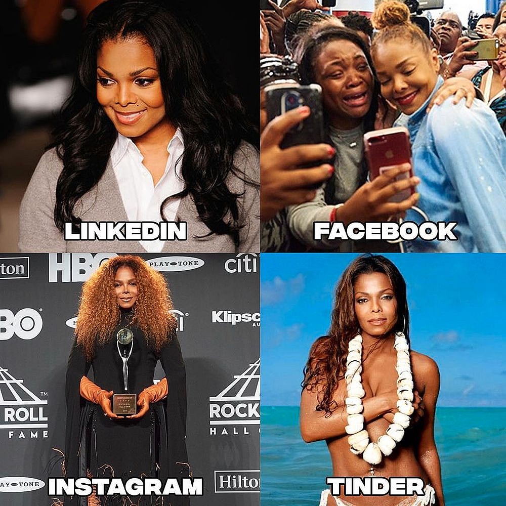 Mrs. Jackson was one of the earliest celebs to follow in Dolly Parton‘s footsteps and share her profile pics. Janet’s Linkedin picture featured her in a very respectable sweater vest and white-collar shirt, her Facebook pic showed her embracing a hysterical fan, her Instagram pic showed her with when she was inducted into the Rock and Roll Hall Of Fame, and her Tinder pic featured the star topless while using her right arm to cover up her ample breasts. Sadly, we don’t believe that she is actually on Tinder but if she was everyone would surely swipe right for her topless pic. Nobody kills the social media game like Janet!
