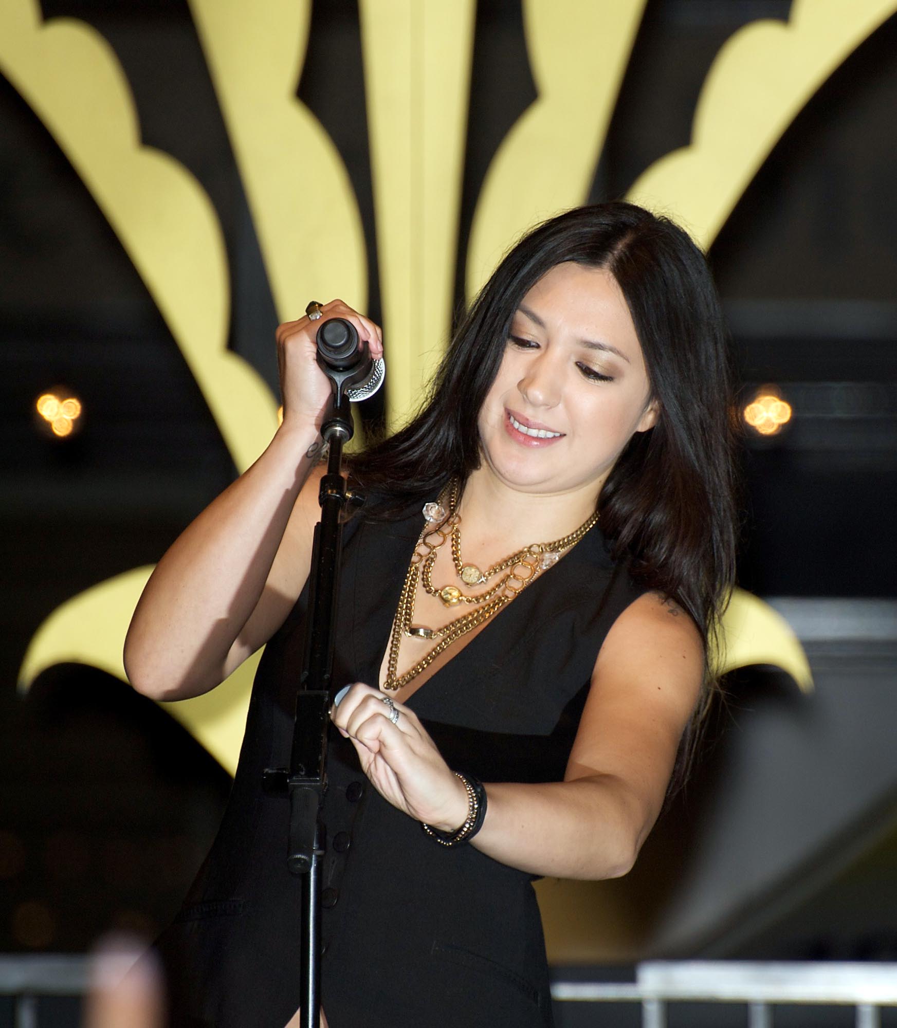 Another photo shows Branch wearing a black, deep V-cut top paired with long black gloves. There’s a blue hue to the photo and the singer stares into the camera. Her blunt bangs cover one eye.