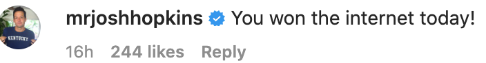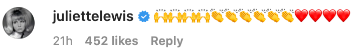 “Old School” actress Juliette Lewis also replied with several expressive emojis, “🙌🙌🙌🙌👏👏👏👏👏👏❤️❤️❤️❤️.”