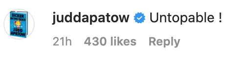 “Knocked Up” director Judd Apatow commented, “Untopable,” while his wife, Leslie Mann, left several crying-laughing emojis, “😂😂😂😂.”