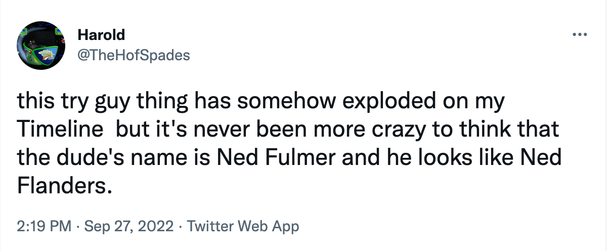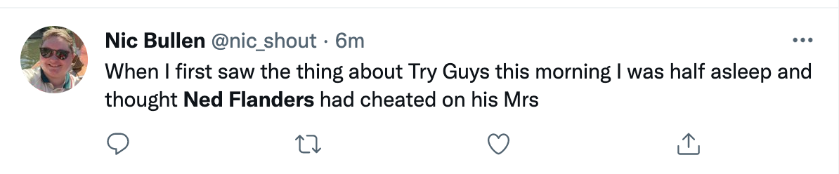 “When I first saw the things about Try Guys this morning I was half asleep and thought Ned Flanders had cheated on his Mrs,” one person tweeted.