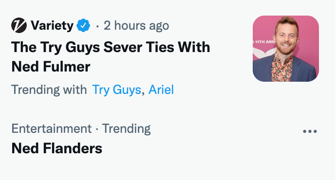 The cheating news took Twitter by storm. “Try Guys” and “Ned Flanders” began trending on Twitter.