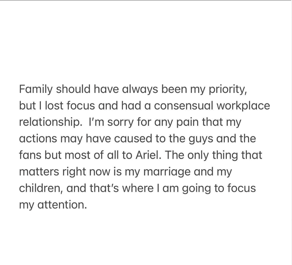 “Family should have always been my priority, but I lost focus and had a consensual workplace relationship. I’m sorry for any pain that my actions may have caused to the guys and the fans but most of all to Ariel. The only thing that matters right now is my marriage and my children, and that’s where I am going to focus my attention,” his Story read.