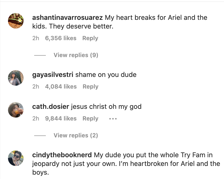 This fan noted how Fulmer jeopardized the entire group writing, “My dude you put the whole Try Fam in jeopardy not just your own. I’m heartbroken for Ariel and the boys.”