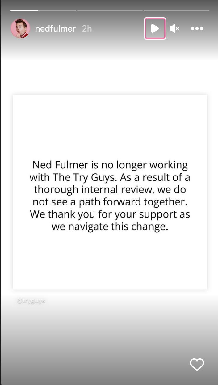 “Ned Fulmer is no longer working with The Try Guys. As a result of a thorough internal review, we do not see a path forward together. We thank you for your support as we navigate this change,” their Instagram Story read.