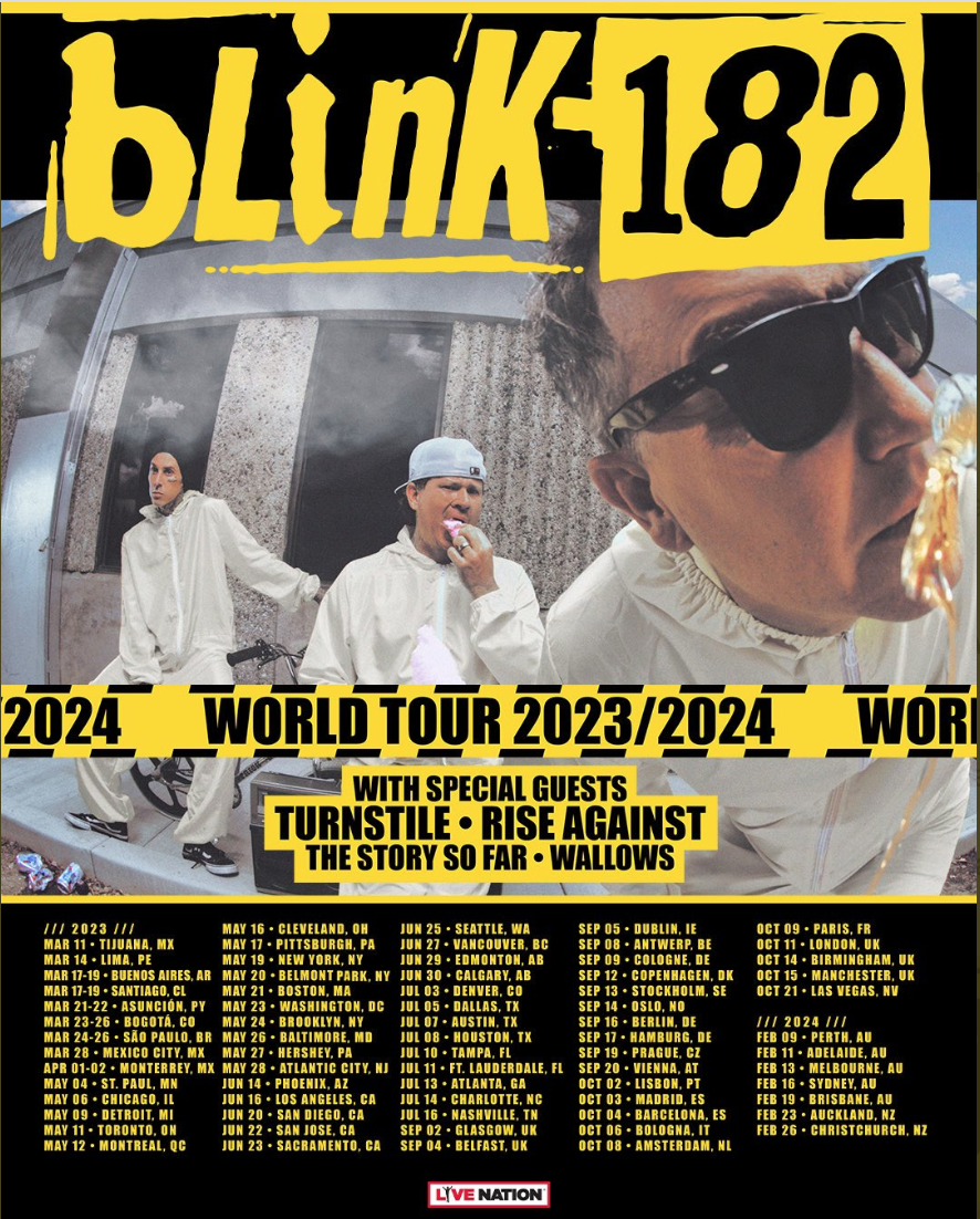 Blink 182’s 2023/2024 World Tour will kick off on March 11th in Tijuana, Mexico and make its way to the US in May before heading across the pond to the UK in September.