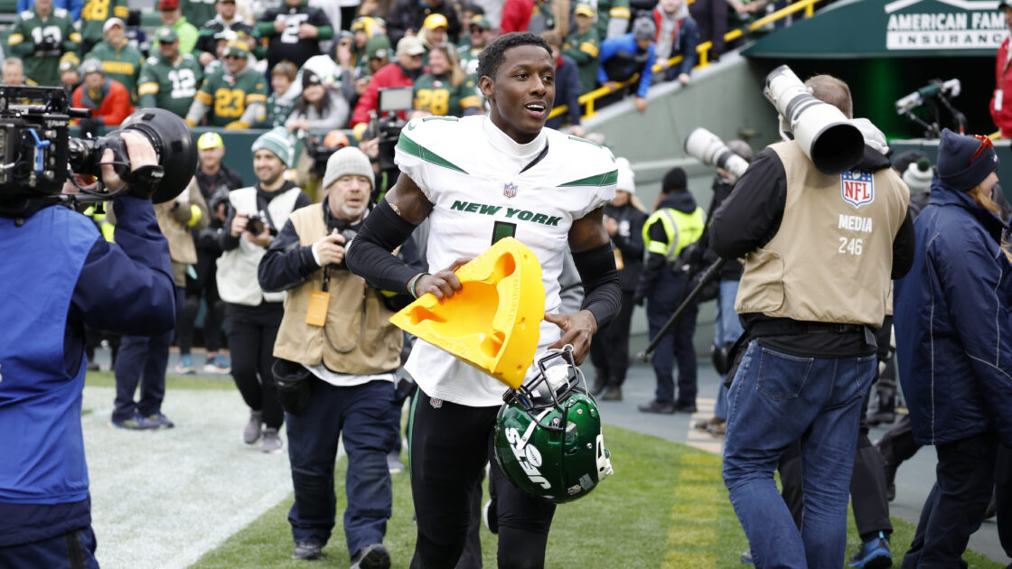 NFL Network’s Tom Pelissero also Tweeted a video of Gardner, writing, “#Jets CB Sauce Gardner wearing a cheesehead as he leaves the field, until a #Packers player (looked like Allen Lazard) knocked it off his head. Big win for the Baby Jets at Lambeau Field.”