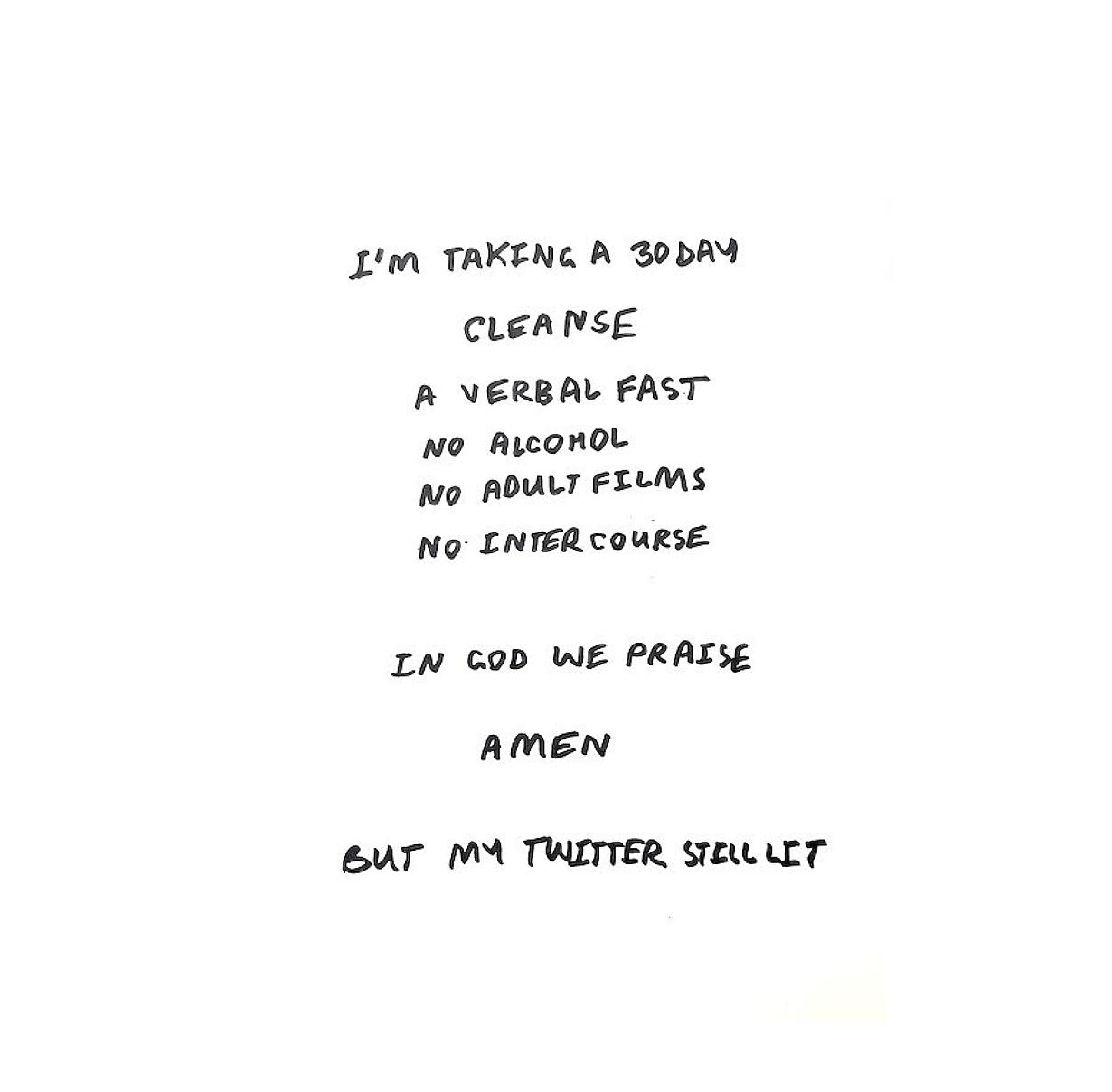 The tweet was accompanied by a screenshot which read, “I’m taking a 30 day CLEANSE. A VERBAL FAST. NO ALCHOL. NO ADULT FILMS. NO INTERCOURSE. IN GOD WE PRAISE, AMEN.”