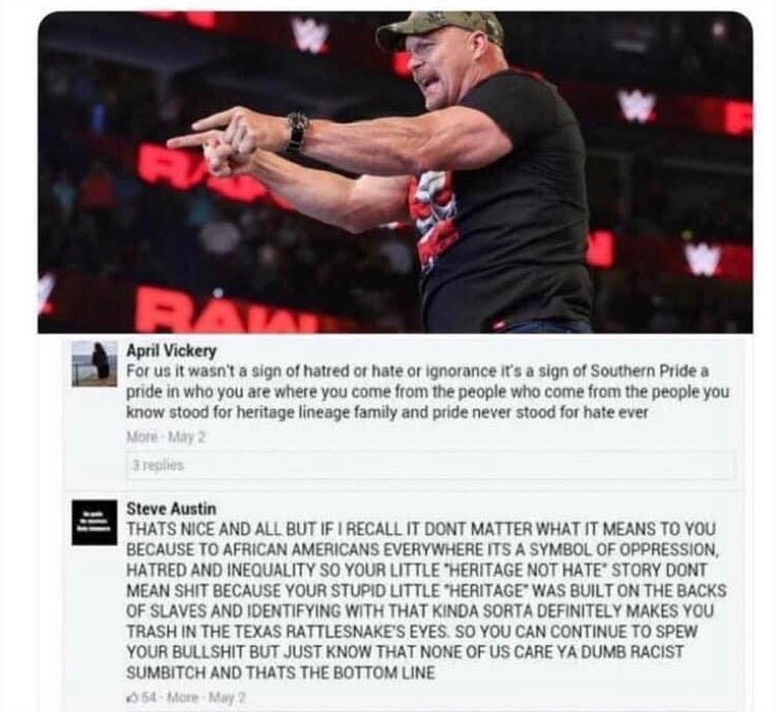 “THAT’S NICE AND ALL BUT IF I RECALL IT DON’T MATTER WHAT IT MEANS TO YOU BECAUSE TO AFRICAN AMERICANS EVERYWHERE IT’S A SYMBOL OF OPPRESSION, HATRED AND INEQUALITY…” a strongly worded message from Stone Cold began.