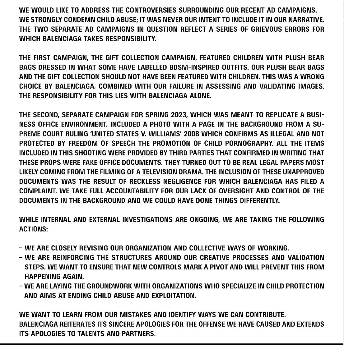 “We would like to address the controversies surrounding our recent Ad campaigns. We strongly condemn child abuse; it was never our intent to include it in our narrative. The two separate ad campaigns in question reflect a series of grievous errors for which Balenciaga takes responsibility,” the statement reads. “The first campaign, the gift collection campaign, featured a child with plush bear bags dressed in what some have labeled BDSM-inspired outfits. Our plush bear bags and the gift collection should not have been featured with children. This was a wrong choice by Balenciaga, combined with our failure in assessing and validating images. The responsibility for this lies with Balenciaga alone.”