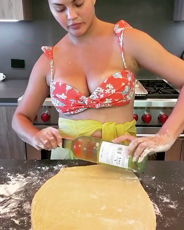 It’s no secret that Teigen loves to cook but we didn’t realize how involved her upper half was in her cooking. On Sunday, Chrissy put her chest on display as she used a wine bottle as a rolling pin to flatten out her dough.