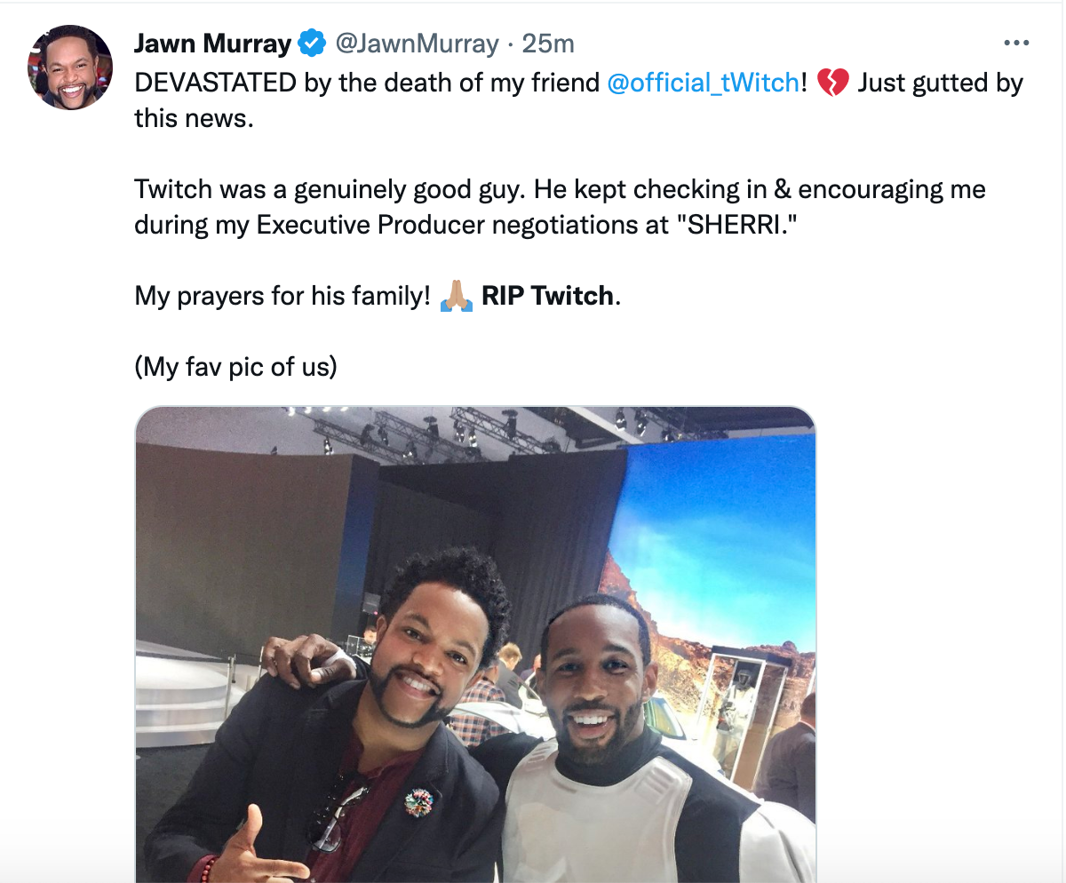 “DEVASTATED by the death of my friend @official_tWitch! 💔 Just gutted by this news. Twitch was a genuinely good guy. He kept checking in & encouraging me during my Executive Producer negotiations at ‘SHERRI.’ My prayers for his family! 🙏🏽 RIP Twitch.”