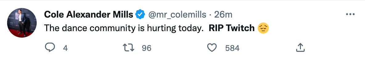 “The dance community is hurting today. RIP Twitch 😔,” Cole Alexander Mills tweeted.
